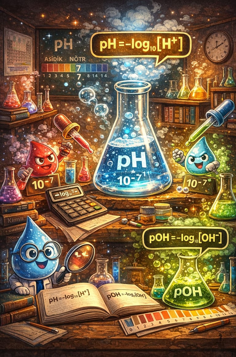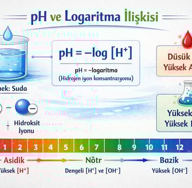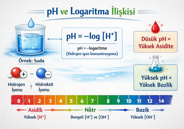 Bir çözeltinin asidik ya da bazik olma durumu, içindeki hidrojen (H⁺) ve hidroksit (OH⁻) iyonlarının derişimine bağlıdır. 19. yüzyılda yapılan çalışmalar sonucunda bilim insanları, saf suyun H⁺ derişimini 10⁻⁷ mol/L olarak bulmuştur. Ancak günlük hayatta bu şekilde bir pH değeriyle karşılaşmayız. Bunun nedeni, bu tür sayıların oldukça küçük olması ve okunup yorumlanmasının zor olmasıdır. İşte tam bu noktada matematik, özellikle de logaritma, devreye girer.
